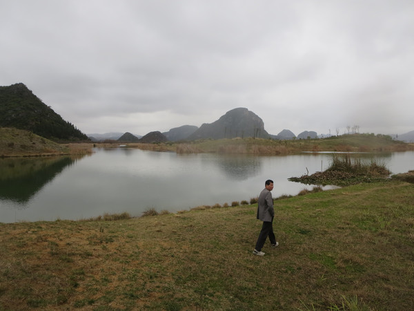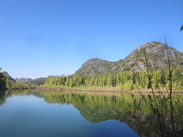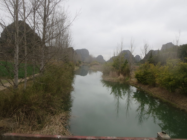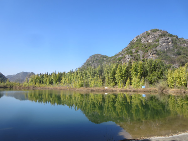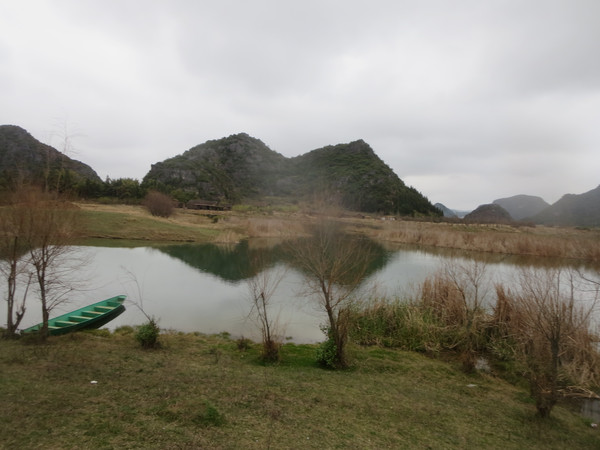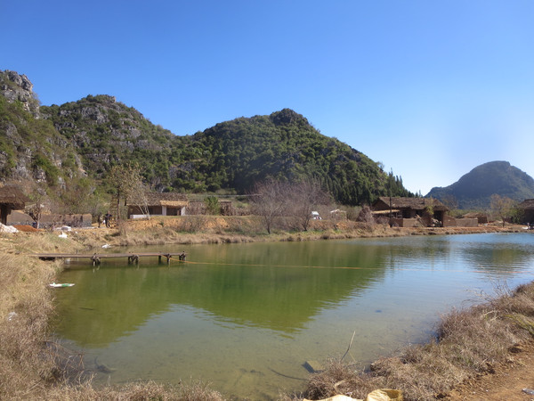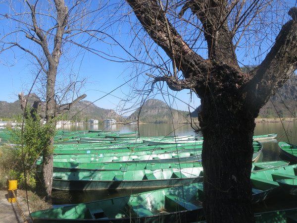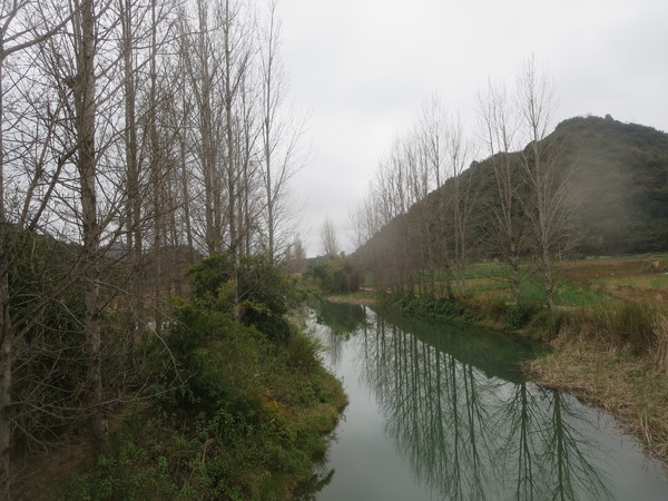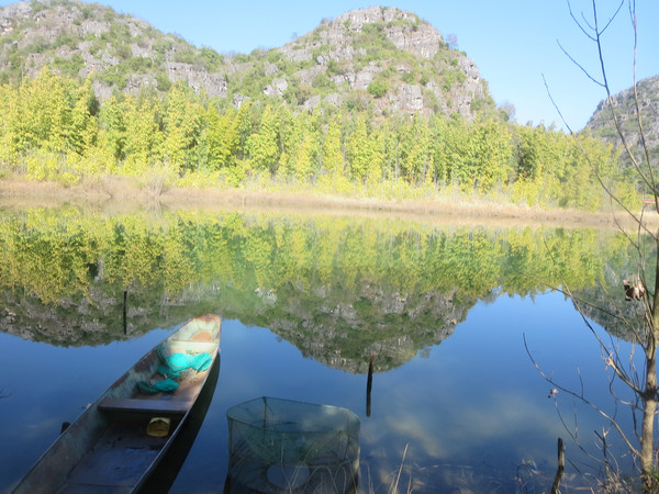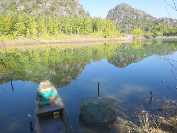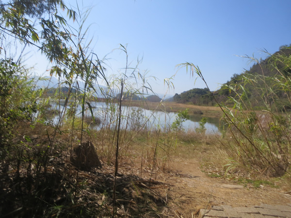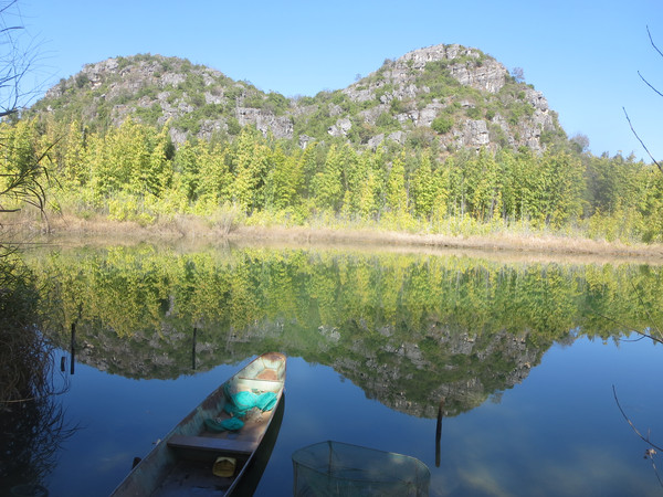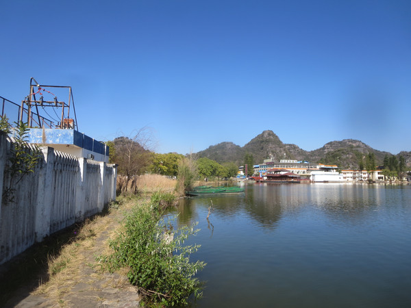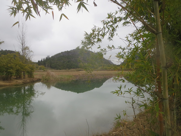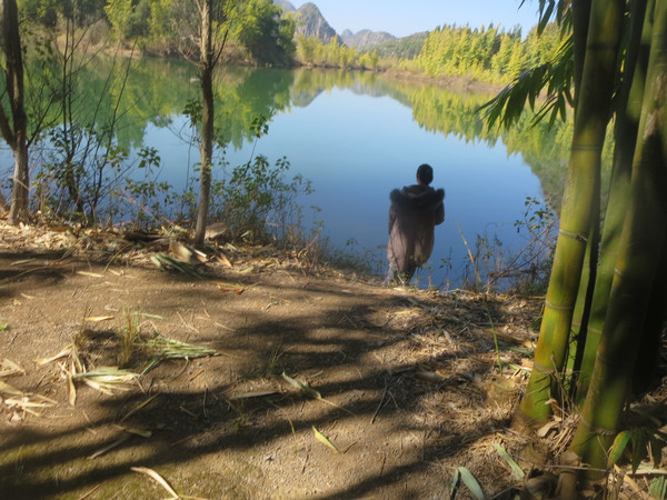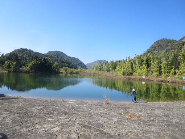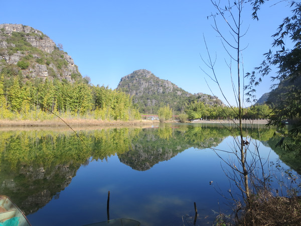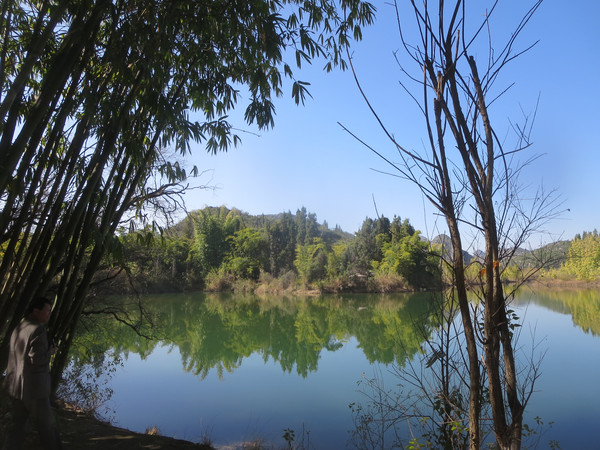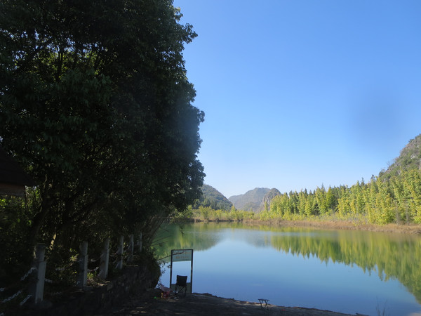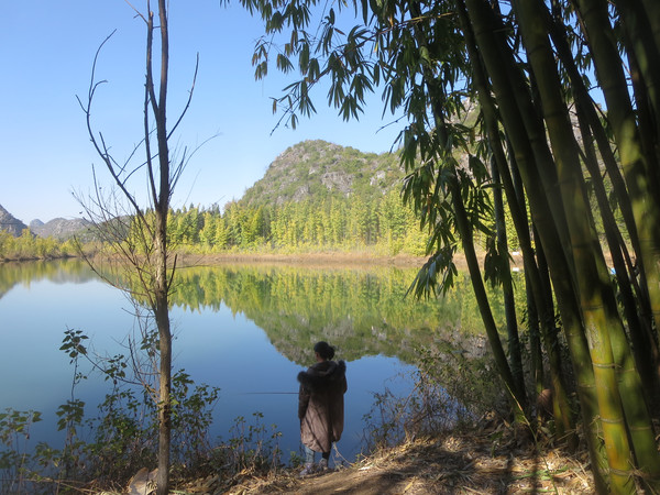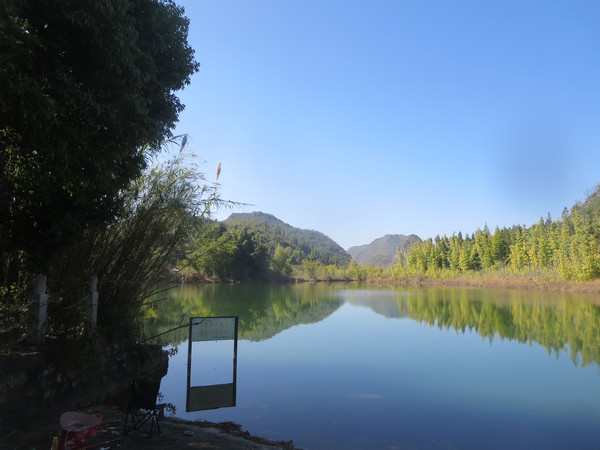大湾子的游船码头现在停止开放,门厅有点残破,不知道是冬天人少停了,还是这里坐船人少不合算所以关了,有个女子在里面钓鱼,这里面前是个平湖,倒映着四周的山峦竹林,很漂亮。