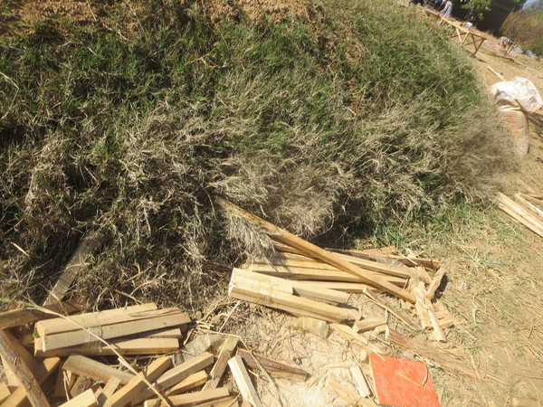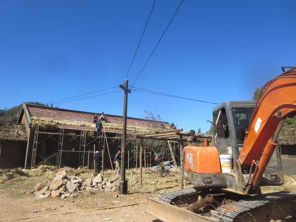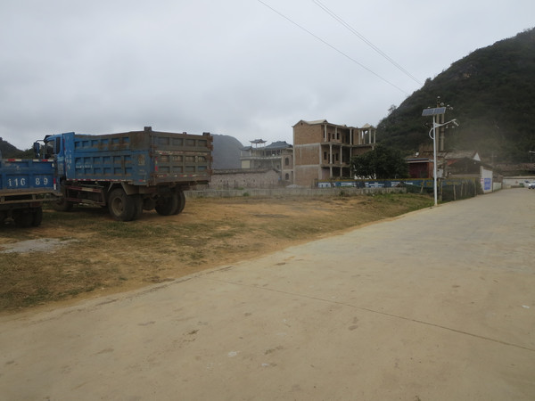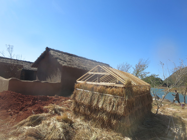 呦,这里居然在建一些茅草屋,看来好像是搞旅游设施或者度假村,远处停着的车都是四川牌照,又是什么集团过来开发的。