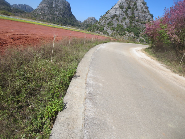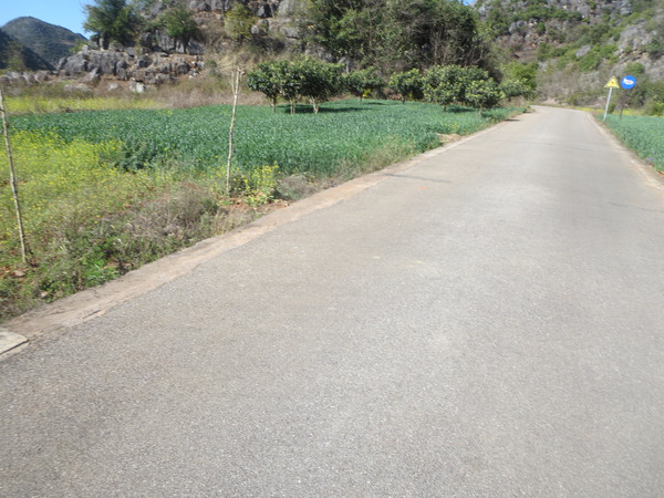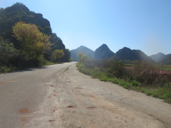 从普者黑村这边出发,往景区大门方向而去,开始观光车道与公路相差不远,平行的,没多久,观光车道大幅右转,两者分道扬镳。
