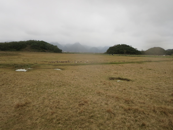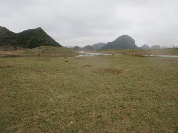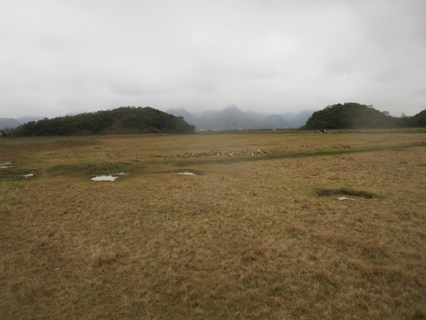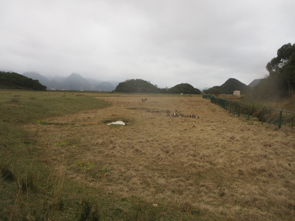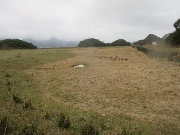 过高岗,有平原,其实是原先的沼泽干涸了,形成了大块旱地,靠近河流有数十米宽的地方,自然形成干的草地,属于景区,然后再往外延伸,是一大片较低的草地,也是景区的范围,再往外有铁栅栏,外面就是农田与远处的村庄了,田里有三三两两的农民在干活,不知道忙些什么。