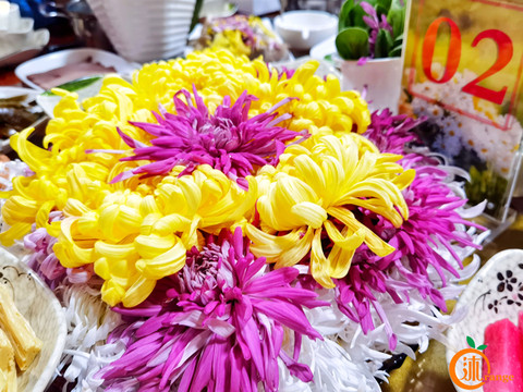 黄色、紫色、白色五颜六色,满满一桌。鲜嫩的菊花从采摘到下锅不过1小时。最大程度保证了它的新鲜度。菊花不易涮太久,锅开后,涮七下,满口清香。