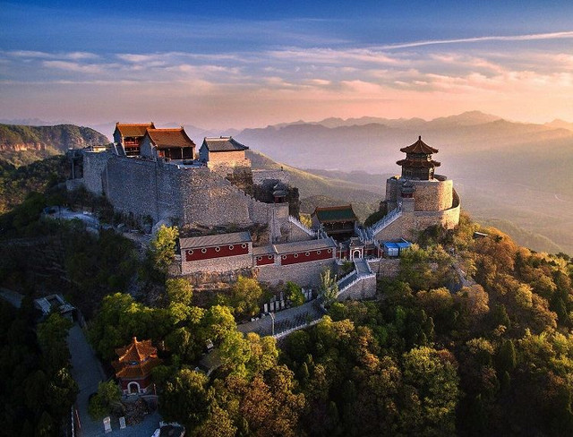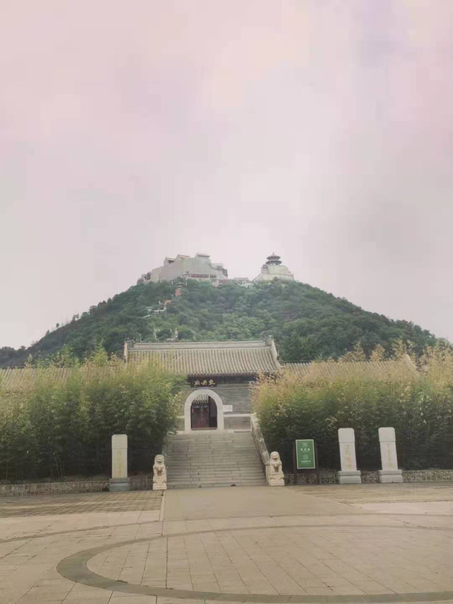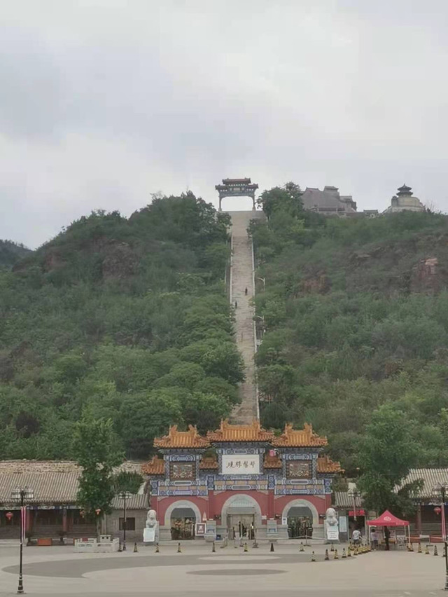 丫髻山座西北朝东南,满山苍松翠柏,郁郁葱葱。山下错河如玉带环绕,山前有四十八盘台阶直通山顶。山后为悬崖绝壁,挺拔险峻。第一段爬上去有个大平台,这里有个东岳庙,个人建议体力不好的就到这里就好了。