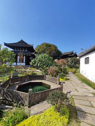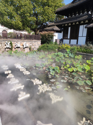 村子不大,游人前往主要看的是岳园。公园虽小,造景却很是用心,移步换景,尽显江南精致,六角形的欢潭水清澈透底。荷花塘上架有石板桥,两侧水塘里写着岳飞的满江红,时不时还白雾缭绕,远望好似仙居的经典场景。不禁感叹,这里新农村建设真是好。