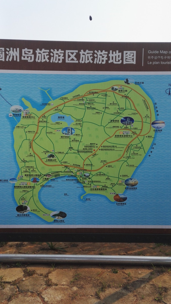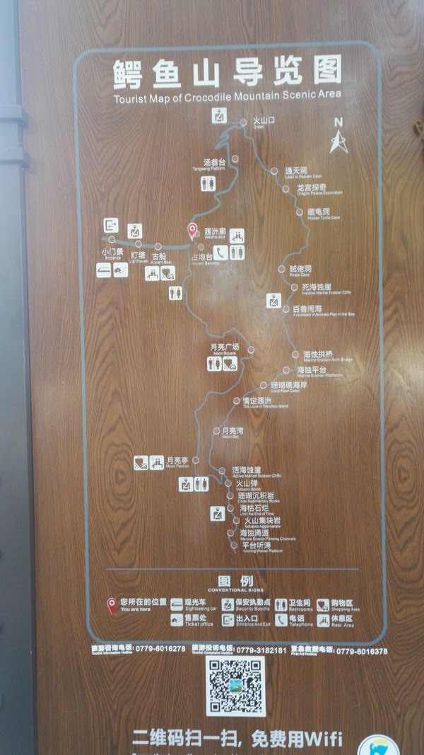 涠洲岛 地图,就在售票大厅出来的地方,虽然不是非常详细,还是可以拍一张。出来我就联系了民宿店家,他已经早早等着了,态度也特别好,来接的车也是岛上独有的三轮车,可坐四个人,两两相对而坐,没有门特凉快。大概十几分钟,就到了。其实店家来接的原因之一就是,你自己找车过去估计是找不到的,他们这种民宿都是在不同的村子里,各个民宿之间相距又非常近,自己实在不好找。我定的民宿是在滴水丹屏和鳄鱼山景区之间(地图西南角),其实全岛不大,景点民宿定在哪里都可以,都很方便。
