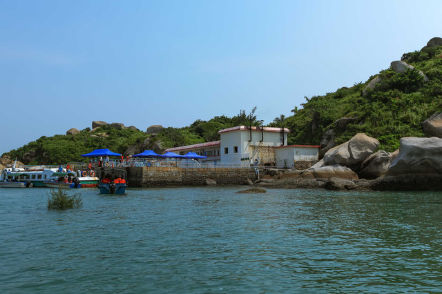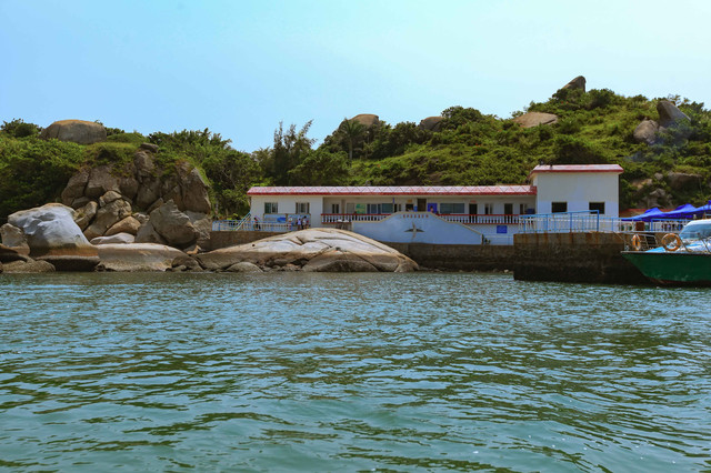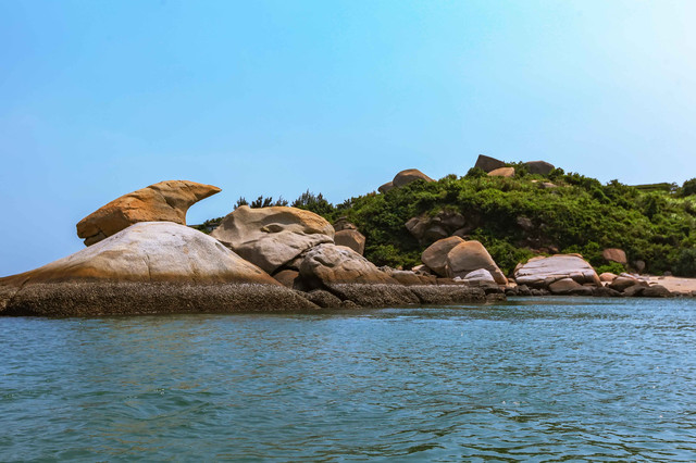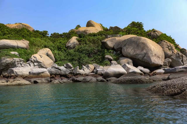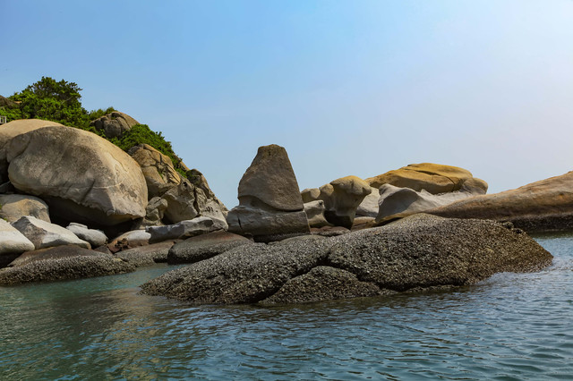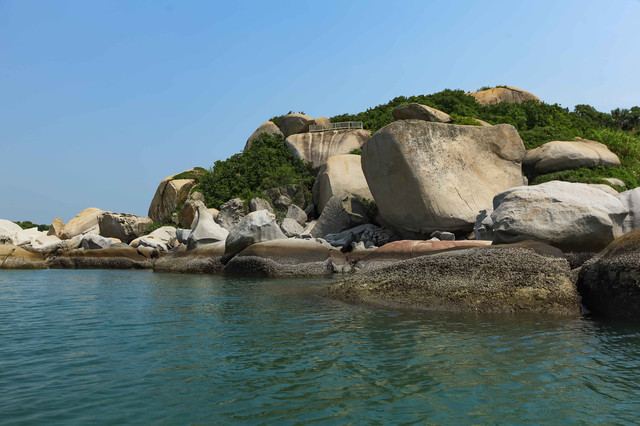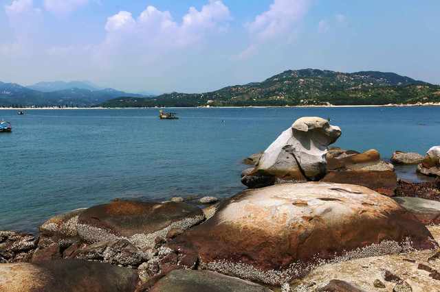 上岛之前,第一个动作是围绕全岛看岛四周的动物石像景观。 这个岛与大亚湾东部海域中的100多个岛屿不同的是,它的四周很神奇地堆满很多巨型寸草不生的顽石。这些顽石经年累月经海水冲刷后形成的石像,你大可展开想象去揣摩,有的搭眼一看,就知道,哈哈,那是狗,嘿嘿,那是婴儿,嚯嚯,那是海龟……当地旅游部门已经有取名的,比如“绵羊戏海”“龟璞飞鸟”“骏马探海”等,倒也栩栩如生。