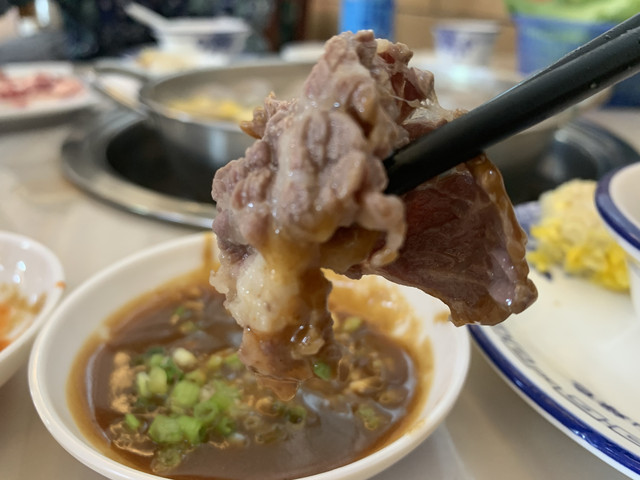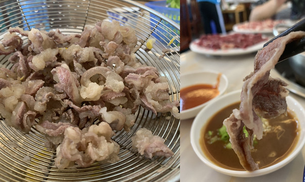 沙茶酱和蒜蓉是这里的灵魂蘸料哦。调料是自助的。6元/人;牛板筋在上海的火锅店没有吃到过。肉和筋相间。据说是牛里脊肉旁边的部分。非常推荐!(他们家的牛板筋有2种,我们要的是生的)