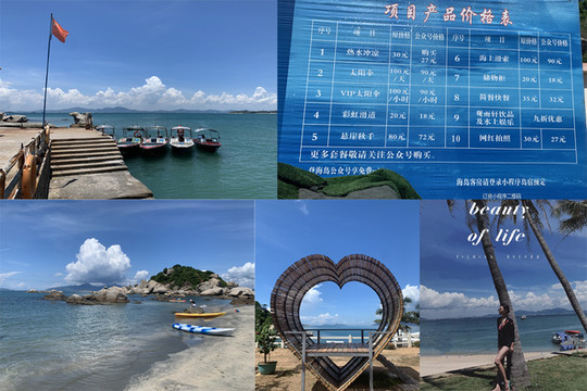 亲测评价:作为打发时间的小岛。不要与国外对比的话,风景还是可以的。当地人也是会过来玩玩水的;基本上目前流行的网红拍照项目和水上玩乐都有了;如果在岛上过夜的也有2种民宿别墅选择。携程上有好多小姐姐小仙女推荐打卡。网红的房间,网红的早餐,网红的海边浪漫晚餐。拍照漂亮的啦。更适合情侣或者亲子!