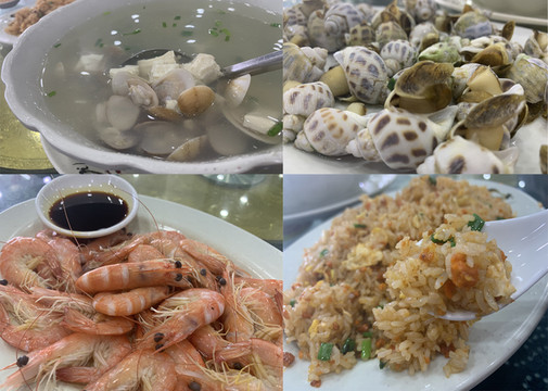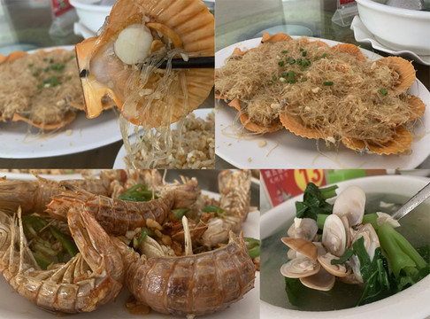 选择理由:餐厅位于南湾2号码头的沿街口。招牌还是比较明显的。地址:巽寮湾金海湾大搞兰亭假日酒店隔壁90米处。除了用餐他们家还有住宿。由于是中午出海回来。所以是团购了2人套餐来吃。套餐包含:海鲜2选1(白灼海虾或者皮皮虾)、姜葱炒花蛤、蒜蓉蒸粉丝、海胆炒饭、海鲜汤、清炒时蔬、纸巾、茶位费;