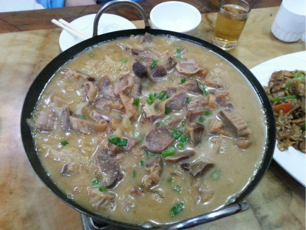 我们晚上8点到达阿尔山市,先去了酒店旁边的一个全羊馆,护心肉汤馆,就是温泉街,靠近中央大转盘。点了:蘑菇炒羊肉38,红焖毛肚(就是羊肚)(但是有些膻味,我们吃不惯)48,还有一个白菜炖豆腐20,还有米饭,餐具,一共110.这家的手把肉我看了菜单(有菜单的)是60元/斤。我们没要,但是这个价格还是合理的。其实我们在海拉尔吃得烤羊排才40/斤,太好吃了,后面叙述。