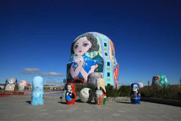 今天我们离开酒店已经是10点钟了,我们先去了套娃广场,在国门景区那里,就是一个荒郊野外的地方造了一个套娃过程,我们开过去的时候,看见和俄罗斯的口岸也在那里。今天和昨天一样,风实在太大了,虽然太阳非常好,但是非常的冷。我们拍了些照片就走了。也开到国门景区看了看,都是团队,我们就走了。