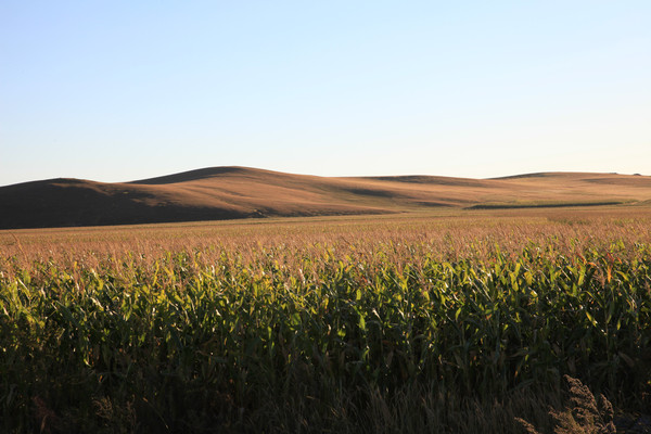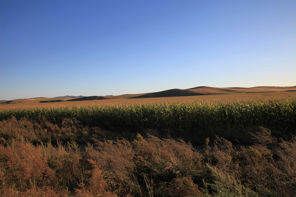 夕阳下的玉米地和远处的草原