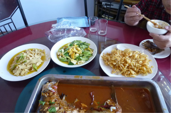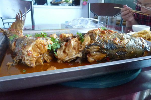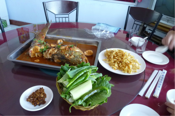 上了往长春方向的高速公路。2点10我们下高速,前往查干湖,查干湖景区离高速公路12公里,到那里我们找了一家何家大院的饭馆,胖头鱼开价30/斤,我们要了一条5.6斤的鱼,然后要了干炸小虾40,最后谈了200.另外帮我们配了些素菜。我们开出去拍了湖,回来正好鱼炖好,这个鱼是大铁锅,用柴火炖的,要炖40分钟了,用的东北大酱,味道很好,鱼没有腥味。但是我们为了要赶飞机,所以把鱼头吃了,骨头拆了,就打包带走了。我们4点10离开查干湖景区的。