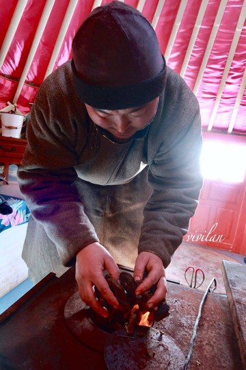 走进蒙古包,完全是冰火两重天,瞬间让身心放松下来,暖意袭来,能够看到简单却有特色的房间陈设,生活用具上都有些蒙古族花纹装饰,家具也有些斑斓的花纹点缀其中,不大的蒙古包,承载着简单的生活日常,放置在中央的铁炉子,可以取暖,也可以烹饪三餐。而用牛粪烧炭火,这一属于牧区特有的生活习惯,也得以保留下来。