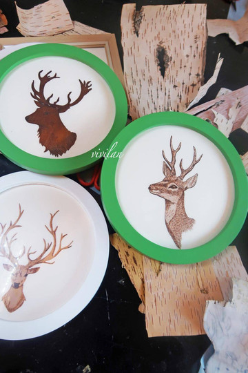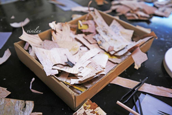 喂完小鹿自驾车大约十分钟,就来到了阿尔山树皮画艺术馆,在这里可以选择喜欢的图案来完成手工制作,因为时间有限,我选择了一个鹿头的样子,先在纸上把轮廓画下来,然后再用剪刀沿着边缘裁剪,大约二十分钟后就完成啦。