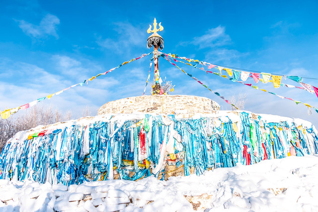 很多可能会看不明白,这是什么?先科普下哈——敖包,蒙古语“堆子”之意,即在草原的高山上堆积石头为台,重叠作圆锥体。敖包上竖旗杆悬挂五颜六色的布条或纸旗。