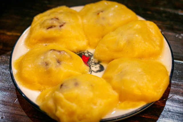 粘豆包:每到冬季家家户户都会包粘豆包,是用江米面做的也就是糯米面,里面是豆馅,自己有时间就多包点粘豆包,无论生熟都可以直接冷冻保存,吃的时候蒸或者煎都是美味。也是这里必不可少的一道主食,可以和馒头相媲美,粘豆包是儿时最甜美的记忆,可以蘸糖或者蘸糖稀。(ps:某种程度上来说,个人觉得和汤圆很像,只是水煮变成蒸的。)