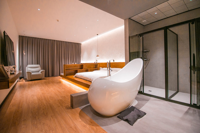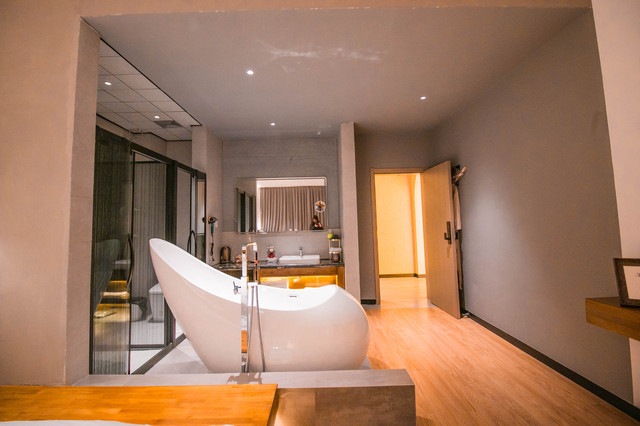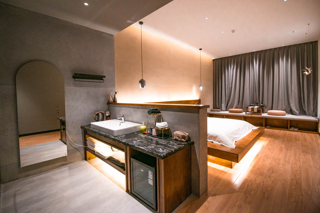 走上阶梯,到达最顶层,两边及中间都是客房区域,整个客房空间都很有设计感,客房大而精,比较小资,有榻榻米、泡茶的茶具及茶叶,特别迎合年轻人的品味。