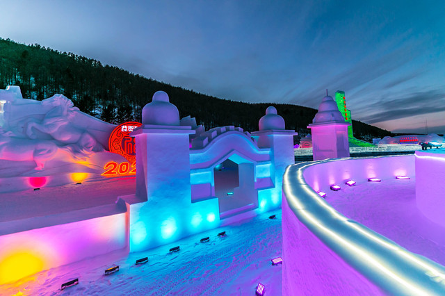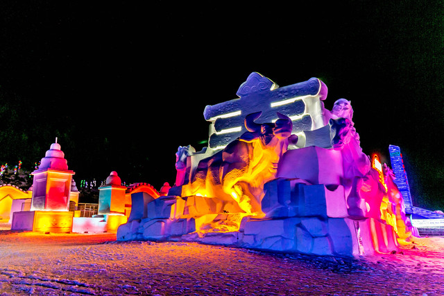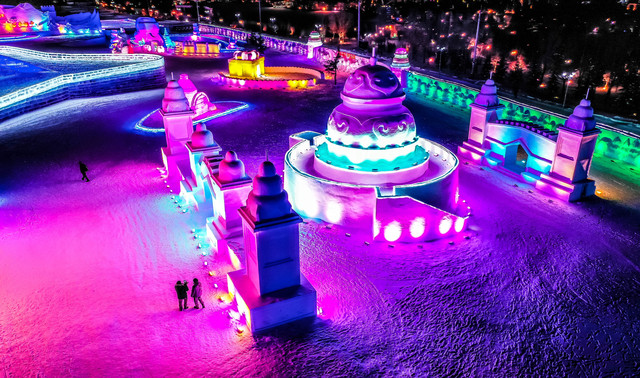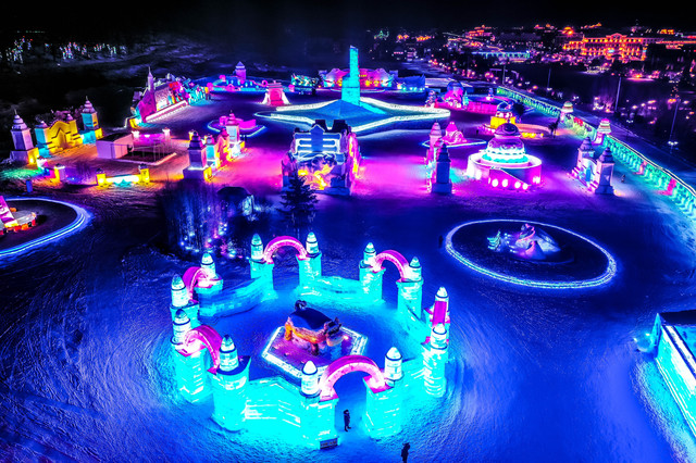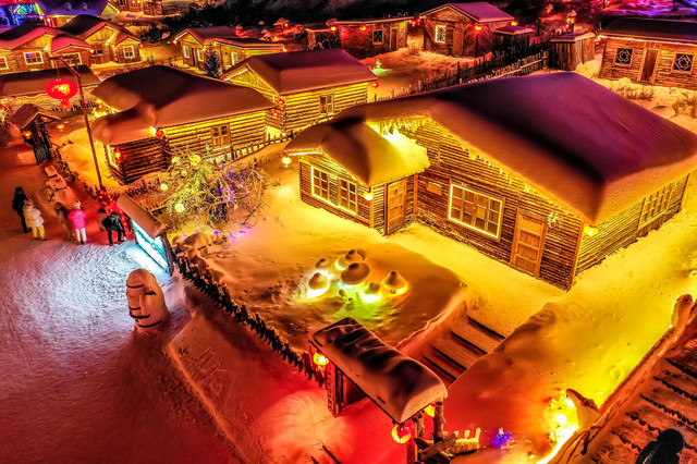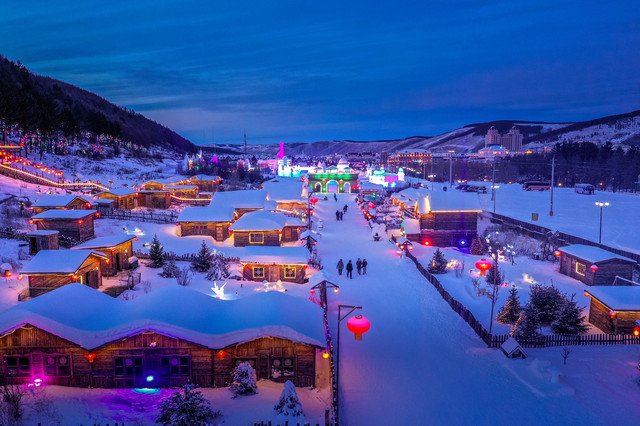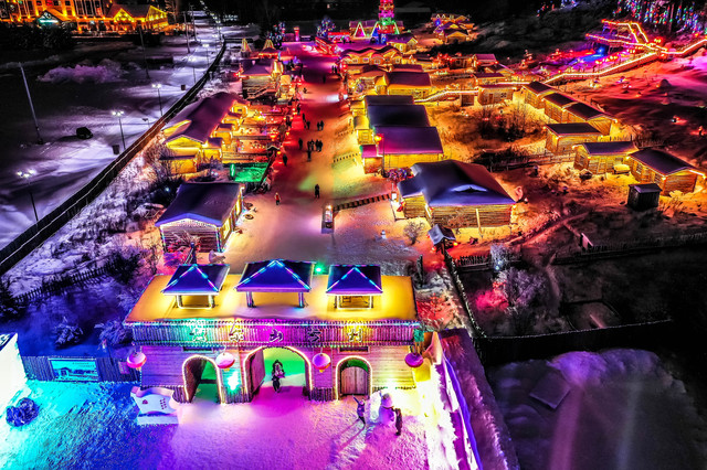 同时,与雪村大门正对着的冰雪乐园,雪雕、冰雕的灯光逐渐亮起,从空中俯瞰,简直是一座雪王国,照亮夜晚中整座小城,仿佛不再寒冷,多了一丝丝暖意。