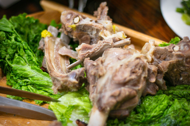 手把肉:2斤左右,清水煮,没有任何调料,盛出来后会额外配蘸料,煮的时间比较长,肉质鲜美,很容易骨肉分离。