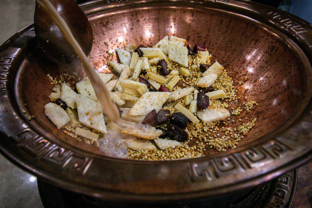 锅茶:现场炒的,有奶茶、奶片、牛肉粒等辅料,要趁热喝,味道很正宗,有小伙伴一个人就喝了4碗,一锅大概有图中的碗——10碗左右。