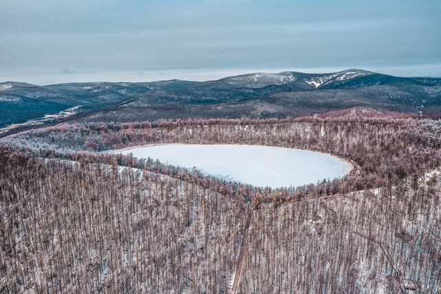 阿尔山天池是中国第三大天池,从上空俯瞰,是一个比较奇特好看的形状,是由火山喷出物落在喷火口周围形成一道环状围墙,中间形成圆形凹坑,多年积水而成。