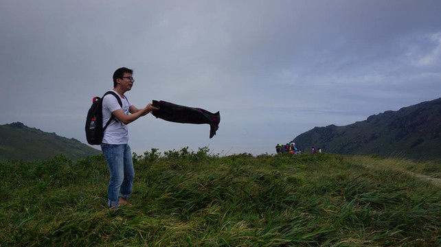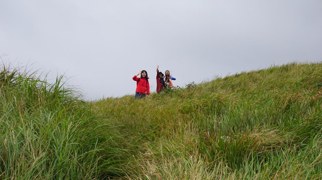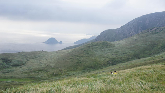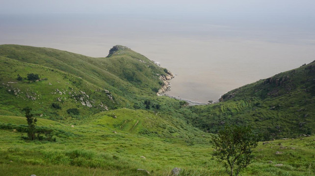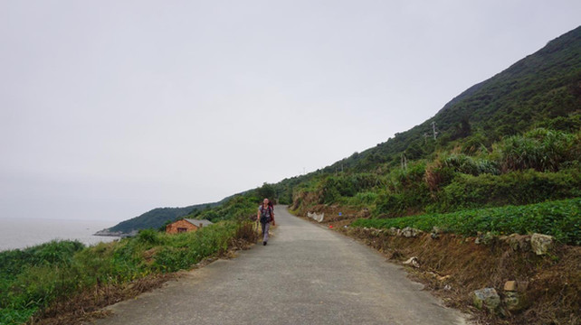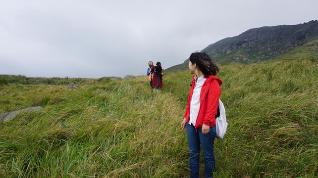 穿过海岸边的村落,开始爬岛上最高山红纪洞山,半山即是“南国天山”草场。我也很奇怪,这里海拔200多米,怎么会是草甸植物呢?这里面对大海,海风很大,高大的树木是难以生长的。