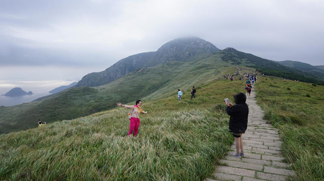 嵛山岛布列于东海万顷碧波之上,山、海、湖、岛、草景观在此浓缩,素有“南国天山”“东海明珠”的美誉。最大的大嵛山岛也不大。打卡的地方是海拔200多米的大小天湖和天山万亩草场。可以自驾或者乘旅游车上去,特别是带大小行李、帐篷宿营的。我沿着海岸边环岛公路徒步观海。