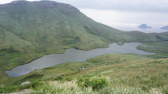 走到半山就到了“海上天湖”,有大小两个天湖。两湖相距1000多米,各有泉眼,泉流不息,成为岛上的淡水饮用水源。湖周围群峰环拱,其状似“盂”,嵛山岛即由此得名。湖四周山坡平缓,就是万亩草场。