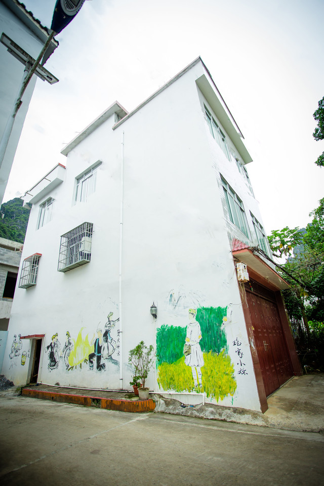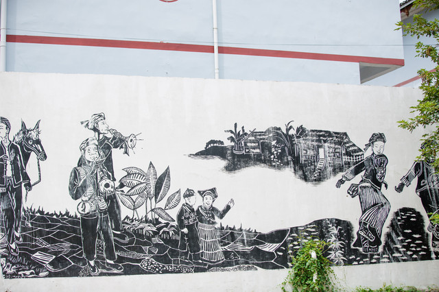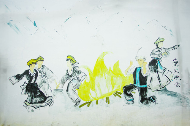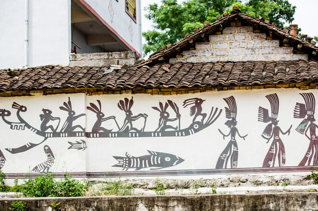 除此之外,排岜的民居建筑都以坐北朝南的坡屋为主,他们运用自己的智慧,将艺术与瑶寨文化相结合,将达努节、瑶锦、瑶鼓等瑶族文化元素对房屋外墙进行粉刷,尽情展示瑶寨的特色文化,是一片不可忽略的好风景。