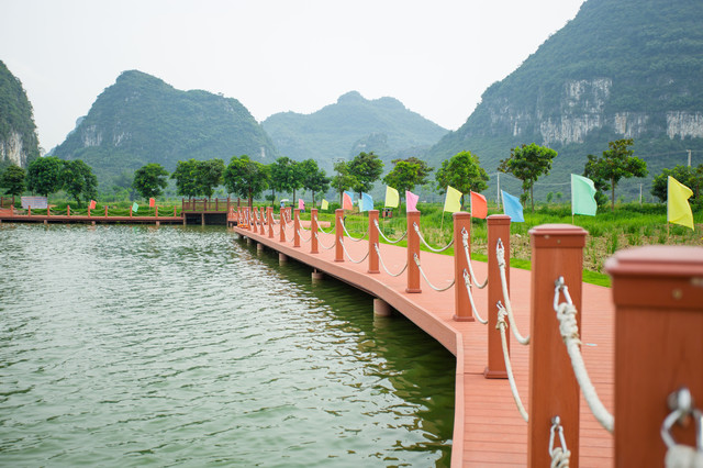 在霞客桃源景区里,乘着画舫船在清水河上游览,两岸翠竹如壮乡姑娘婀娜多姿,岸上是一望无垠的稻田绿浪滔滔,美不胜收。