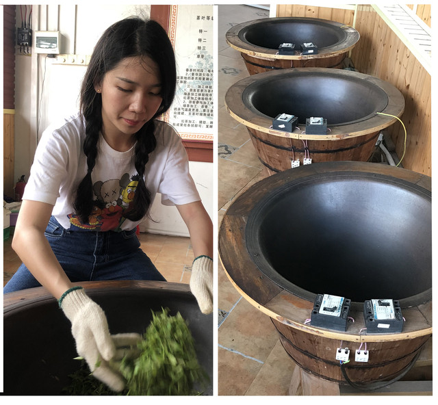 把新鲜摘下的茶叶拿到炒作坊里去体验古法制作茶叶的工艺。古法炒制茶叶用的是土灶头,用果木烧火,现在用电炒锅方便游客体验炒茶技术。当温度达300多度时,双手在铁锅内进行翻、炒、抖、散、揉、捻……