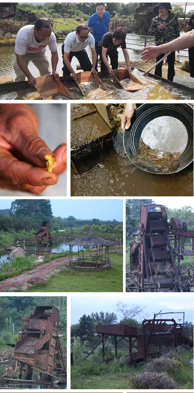 上林人淘金历史悠久,自唐代以来就开始了淘金的历史,掌握丰富的淘金技能,以其特有的淘金技艺征服各地乃至世界的淘金市场。如果你也喜欢金子,那就来淘金乐园解锁淘金技能,体验上林淘金文化魅力与淘金乐趣吧!来到位于淘金乐园东南侧的淘金体验区,这里有一个保留至今旧时上林人淘金池,还有一台斑驳生锈的淘金机器和沙床,体验区里很安静,但每当三月三等重要的节庆来临,这里的安静又会被欢乐的惊喜所代替。原来是乐园的老板把一些砂金撒在水池里,谁淘到就归谁。于是乎一群群游客兴冲冲的拿着淘金盘向水池,一遍又一遍的淘洗着水池中的沙子,再睁大眼睛一遍遍的找寻着那一粒粒闪着迷人金光的小金子,淘到的欢呼声,没淘到的叹息声,在整个乐园里荡漾着……
