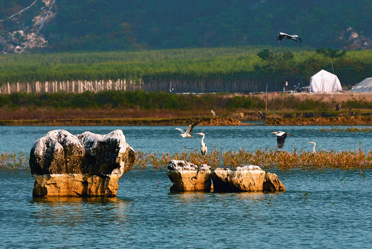 顺着村民的指引来到这片奇山秀水的湿地,看清澈的湿地湖面,水波荡漾着山形树影,白鹤栖息在这儿,时而飞翔时而嬉水,景色美的犹如景色一幅诗情画廊,我们在青山间探索,在绿水间嬉戏,一切尽是这么的美妙!