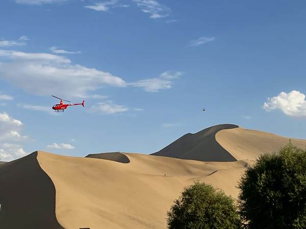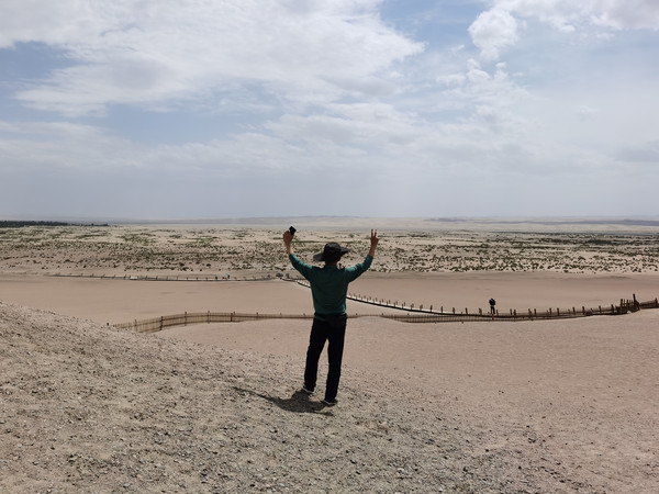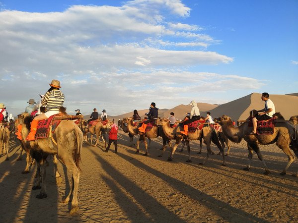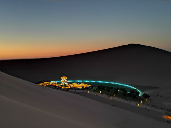 从莫高窟回来后,在酒店好好休息,傍晚出发前往鸣沙山月牙泉。月牙泉三面环山,沙水共生,是难得的奇景。到景区门口时人流涌动,进去之后更是欢乐的海洋,天上飞机轰鸣,地上骆驼成群,本来想体验下骑骆驼,就不凑热闹了。沿着沙地走到月牙泉附近,夕阳西下,坐在沙堆上静静欣赏下绚烂的晚霞,最后一个节目是爬鸣沙山,陡峭不用说了,爬一步退半步,爬爬停停,于晚上9点44分成功登顶,坐在山顶,凉风袭来,月牙泉的灯已点亮了,远处可望见城区的灯火,抬头仰望夜空,繁星点点。