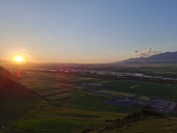 从卓尔山下来,就依依不舍的告别祁连县,前往下一站门源县。听着百度导航,沿着一条无名的盘山小路穿过若干个村庄和农田,就进入了S302,呈现了广阔的大草原景象:紫色的野花拥簇的盛开着,八宝河肆意的流淌,黑色的牛群和白色的羊群星星点点的散落在草原里,苍鹰在天空中翱翔,公路延伸到天际,这是真正的草原天路!行驶几十公里后,进入了G227,车顿时多了起来,翻过景阳岭垭口(海拔3767),路过祁连山东段的第一高山:岗什卡雪峰(海拔5254),地势逐渐平坦起来,出现了大片大片的农田,最终抵达门源县城。傍晚时分爬上了照壁山附近的一个山丘,万亩良田尽收眼底,,大通河一分为二,于20点15分欣赏了日落西山,今天完美收官!