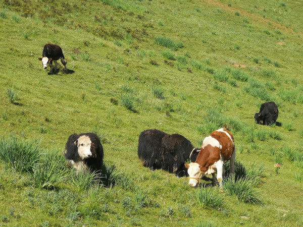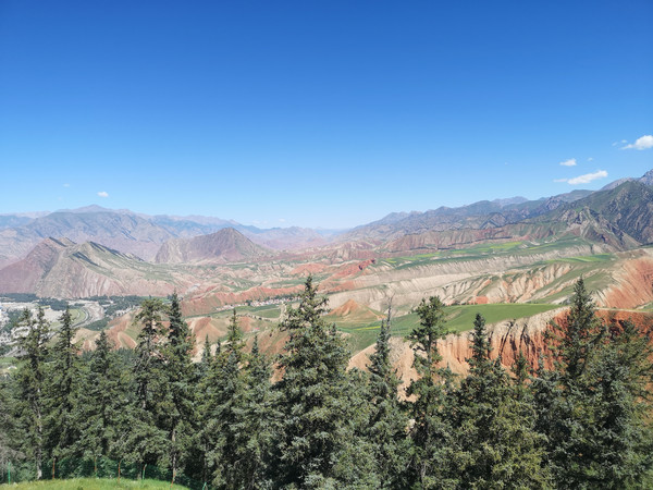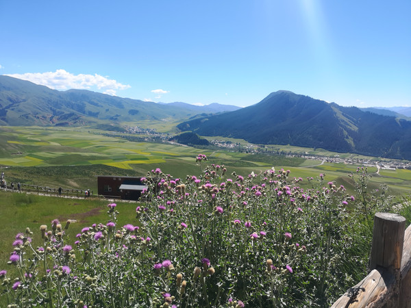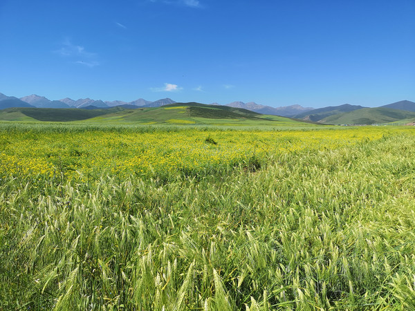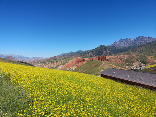 祁连县位于祁连山的腹地,住的酒店就在卓尔山景区。一大早起来,出门就面对金色的油菜花田,山坡上的牛群已经在惬意的吃草。登到卓尔山顶,眼前就是一副绚烂的油画,有丹霞的赤、油菜花的金黄,还有青稞的浅黄、牧草的绿、松树的墨绿。风儿吹过,油菜花的芬芳沁人心脾,闭上眼睛,耳边传来清脆的鸟儿声,这何尝不是世外桃源!