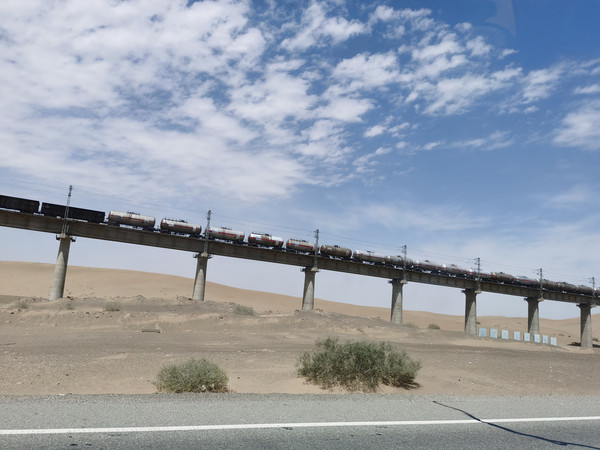 一大早前往翡翠湖,依然封路,工作人员耐心的告诉我明天会开通,好吧,时间不等人,只能开车前往敦煌。沿着柳格高速北上,从侧面俯瞰了翡翠湖,路上变得越发干旱和荒凉,周围的山脉都变成了火焰山、地貌由戈壁变成了沙地,绿色的植被越来越稀少。翻过青山垭口后,可以远远的望见阿尔金山的雪峰,不久就进入了甘肃地界,沿着215国道翻越了当金山口(阿尔金山和祁连山之间的垭口),就一路下坡,海拔降了一千多米,温度升高了十几度,高架的铁路桥穿越过沙丘,黄沙被横风刮过路面,进入了另外一个世界!这一路的加油站条件很恶劣,没有洗手间,或者是收费的洗手间,女士们要有思想准备。