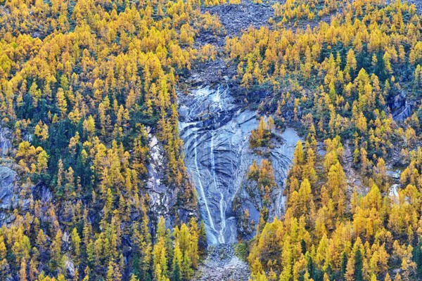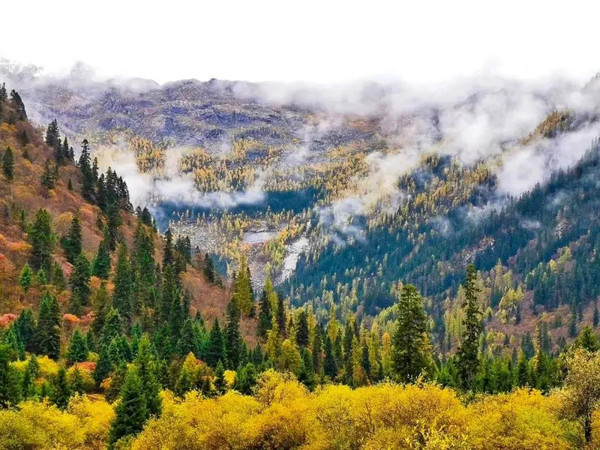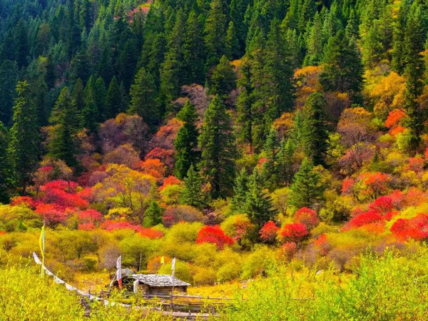 浓密的彩林中,金黄的松林瑰丽奇美,炊烟袅袅下,恍若世外桃源。