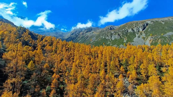 阳光下,彩林被渡上一层金光,显得更加靓丽,随着风起,发出沙沙的声响。