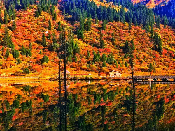 彩林被上帝的颜料调成一幅色彩斑斓的油画,湖泊如一颗颗宝石翡翠镶嵌于此。