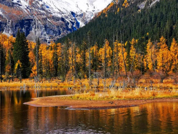 澄净平静的湖面将圣洁雪山和绚烂彩林全部揽入怀中,愈发美不胜收。