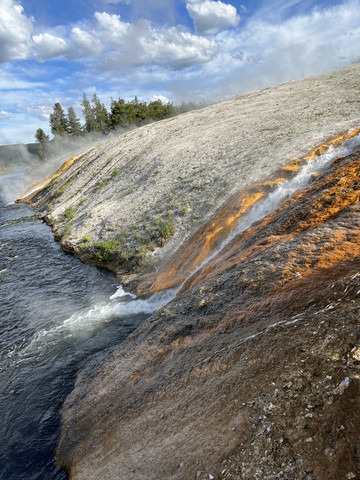 湖水从黄石湖流出后进入一段平缓的丘陵地带,水面平静,容颜不惊,然后注入一段长约38公里,宽达365米,深365米的险峻峡谷,开始奔腾喧嚣起来,这就是黄石大峡谷。峡谷由河水对火山岩和火山灰进行了50万年的冲刷而形成。禁不住感叹水和时间的力量。黄石火山属于活火山,炙热的火山熔岩一直蛰伏在深深的峡谷底下,峡谷越来越深,真担心下面的火龙有一天翻个身就冲天而出。湍急的河水呼啸而下,形成两道壮丽的瀑布。第一道瀑布有33米高,称为上瀑布(Upper Falls),转过一个小弯来到第二道瀑布,该瀑布有92米高,称为下瀑布(Lower Falls)。两挂瀑布的两岸分别设置了几个高低不同的观景平台,可以近距离观赏。如果愿意花几个小时登上附近的一个小山峰,可以居高远望这两挂瀑布段的黄石河的全貌,一般游客很少会有这样的安排。瀑布两侧黄红黑相间的巨岩(推测黄色岩石比较醒目有特色,公园据此得名。)如刀削般高耸坦露,峡谷深邃曲折,激流狂泄轰鸣,惊心动魄,蔚为壮观。下瀑布在阳光折射下隐隐可见一道彩虹。