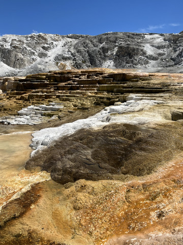 接下来看了一整天各式各样的地热地貌,看到了阶梯状的钙化池,见识了温泉、蒸气池、热水潭、泥地、喷气孔和间歇泉,吸入了不少带着硫磺味的空气,最后两条腿都迈不动了,觉得真看够了,不想再看了。晚上入住的酒店就在老忠实泉边上,也是我们本次旅行入住最贵的酒店,好处就是可以观看到间歇泉喷发。这些地热地貌是因为地表水渗透进地壳,与高温熔岩接触后变成热水或蒸汽,并且夹带着一些熔岩喷出地面,各种嗜热细菌在这些热水流淌的地表繁殖、钙化,给地表着上深浅不同的颜色,有白色、黄色、黑色和绿色等,同时也重塑着地表的形态,有的像错落有致的梯田,有的像石灰渣场,也有黄泥浆潭和蓝绿色的热水池……间歇泉平时冒着热水柱,散发着蒸汽,有时会突然加大喷发量,喷发一段时间后回归常态,喷发间隔时长不一,比如老忠实泉(old faithful spring)每隔90分钟左右喷发一次,误差只有10分钟,忠实之名绝非浪得;有的间隔时长几天或更久。温泉普遍酸性很强,不能接触皮肤。
