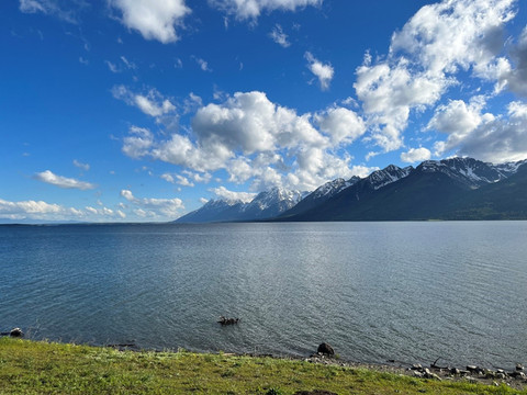 有二十余座,山顶上戴着的雪帽在蓝天白云的映衬下,被阳光照耀得熠熠生辉(照片为的机拍摄,未经任保处理),最高的大提顿峰海拔4198 米,有存留的冰川。山脉下一片平坦宽广的草原,水草丰美,是野生动物的天堂。融雪形成了多个天然高山湖泊,还有蜿蜒曲折奔腾不息的蛇河(Snake River),水质澄明清冽。蛇河上用水坝拦堵形成的杰克森湖为当地最大的水域,回程时我们的汽车就从水坝上开过。蛇河全长1670公里,汇入哥伦比亚河后流入太平洋。由于蛇河水量充沛,又长又曲折,从大提顿返回博伊西的途中数次与它相遇,河岸被水流切割得十分高深且陡峭,有点像峡谷,颇具视觉冲击力。河岸上生长着荒草与灌木,透出原始粗犷的气质,与我们江南纵横交错小家碧玉般的河道风貌迵异,切身地体会到这条河流对当地农业灌溉的重要性。