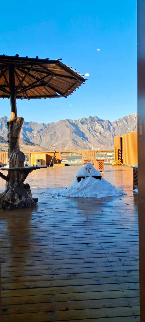 景区门口门前广场白雪皑皑,和远处的山,长城遥相呼应,给人辽阔,圣洁,雄奇的感觉。