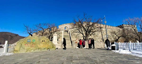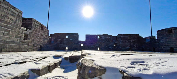 垛口,城墙上落下的白雪让这最美的一段长城又平添了几分妖娆,引到游人诗兴大发,高声朗读起了毛主席的沁园春·