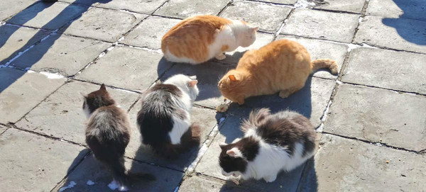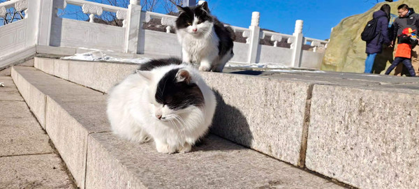 一拨一拨游人从缆车上下来都要来这里逗逗猫,投放些吃食,围观着猫们跑来跑去争抢着食物。大家纷纷拿出手机拍照打卡这美好时光。广场上这几只猫倒是成了一道不可或缺的独特风景。
