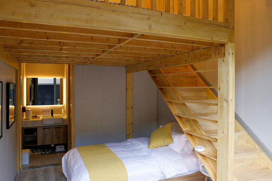 棉花糖和跳跳糖在两边,主人精心设计成LOFT式结构,上下两层动静分离,纯木质构造极具匠心,温馨又自然,非常适合家庭亲子度假。