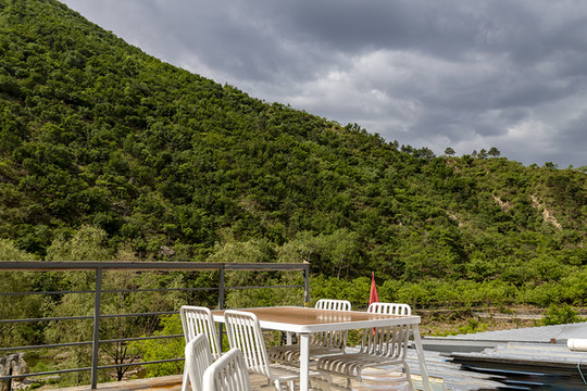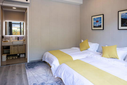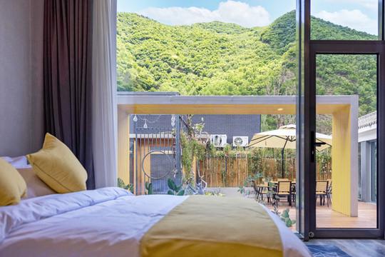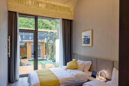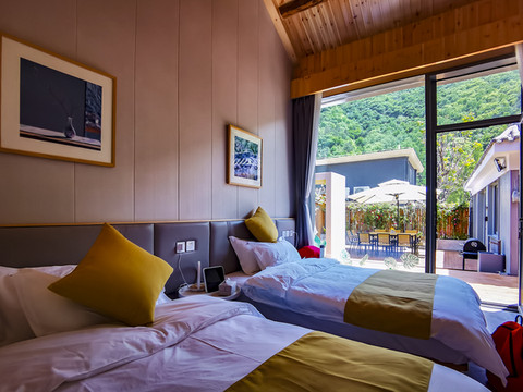 彩虹糖在中间是一间亲子双床房,三口之家同住幸福又快乐。小院客房均采用全景式落地大窗,室外景观一览无余,躺在床上看云启山巅,夜晚数星星望月亮。