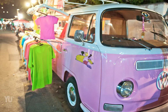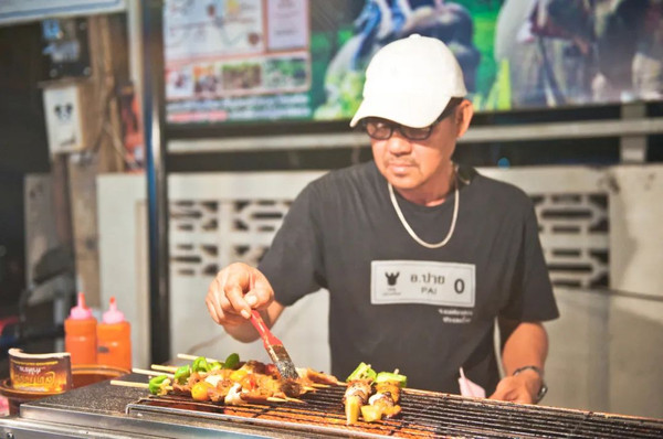 当然,在开始客栈里的夜生活之前,人们总是挤在城镇中心的夜市里。在文创艺术商店和售卖衣服的大众T2复古巴士隔壁,是烟火缭绕的户外美食档。拜县和泰北的美食风味缺不了酸辣二字。烤肉串的酱料以甜酸为前调,以胡椒为后香;鱼虾的鲜味儿卷裹在咸的大蒜汁中,很难描述又忍不住让人反复回味;香茅草炸鸡的奇异香味沿街飘散,飘进我手中刚启开的大象啤酒里,在四季炎热的拜县,冰镇啤酒是一切美好的旅行与生活的动力来源。